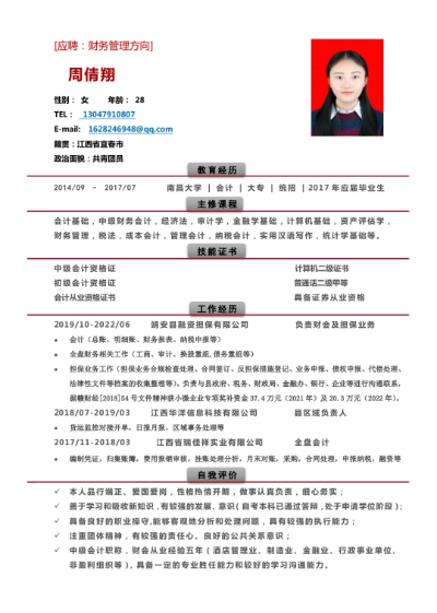本人性格热情开朗,做事认真负责,细心务实,有较强的发展、提升意识,能够客观地分析和处理问题,注重团体精神,有良好的公共关系意识。中级会计职称,会计从业经验五年,具备一定的专业胜任能力和较好的学习沟通能力。 最近一份工作属国有独资公司,担任全盘会计及担保业务工作,负责与县政府、财政局、税务、工商、银行、企业沟通联系。在职期间据赣财经[2018]54号文件精神获小微企业专项奖补资金30.7万元(2021年)及20.3万元(2022年)。